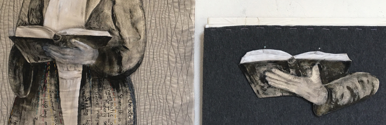 3) Model the hand holding a book and sketch it. (- Didn’t like the first version. With acrylic on fabric, you cannot simply overpaint an area because the paint becomes too thick for quilting. So, I’m creating an appliqué part of hand and book.)